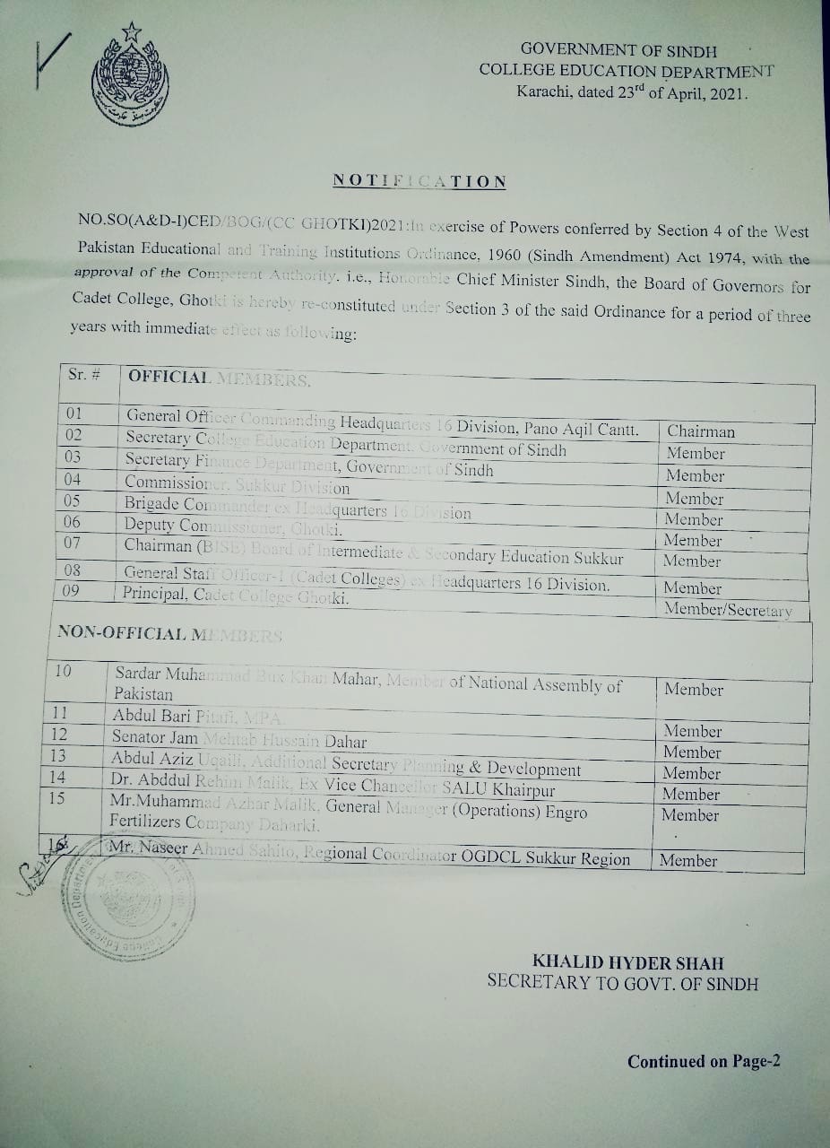 Keeping in view the vision of inculcating quality education patterned on lines of military discipline, code of conduct and character to the students of this illiteracy hit district of northern Sindh, the scheme of foundation of Cadet College Ghotki was sponsored by Ministry of Education Government of Pakistan with an approval of Rs. 167 million. For the purpose, the District Government Ghotki provided with 253 acres of land free of cost. Later, the National Finance Commission (NFC) handed over the college to the Government of Sindh. The Government of Sindh (Education and Literacy Department) approved new PC-1 named as “Remaining works of Cadet College Ghotki” with an approval of 497.971 million. It was, later, revised with approval of 745.027 million. The foundation stone was laid by the then honorable chief minister Ali Muhammad khan Mahar in 2005, hence the construction work began. Flowing against the tides of meagre resources and insufficient infrastructure, the pioneer Principal Honorable Professor Naseem Ahmed Memon took off with commencement of the first academic session on November 08, 2010, with initial intake of 114 cadets. Up to now, three batches of cadets have successfully passed out, while at Present, the college has strength of 367 cadets in class VII to XII. Committed with its mission and vision the college is developing rapidly in its all aspects with the financial patronage of the Government of Sindh, under supervision of the Board of Governor and dedicated endeavors of the College staff.